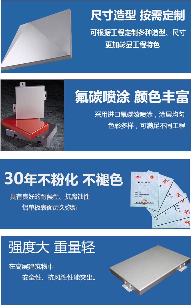 鋁單板采用優(yōu)質(zhì)鋁板加工而成,表層采用氟碳噴涂,不受紫外線、溫度、氣溫和大氣侵蝕,更具有良好的抗彎曲度及優(yōu)良的抗風(fēng)壓性能,并且能夠發(fā)揮其特點(diǎn), 二次開發(fā)使用。鋁單板可加工成各種弧