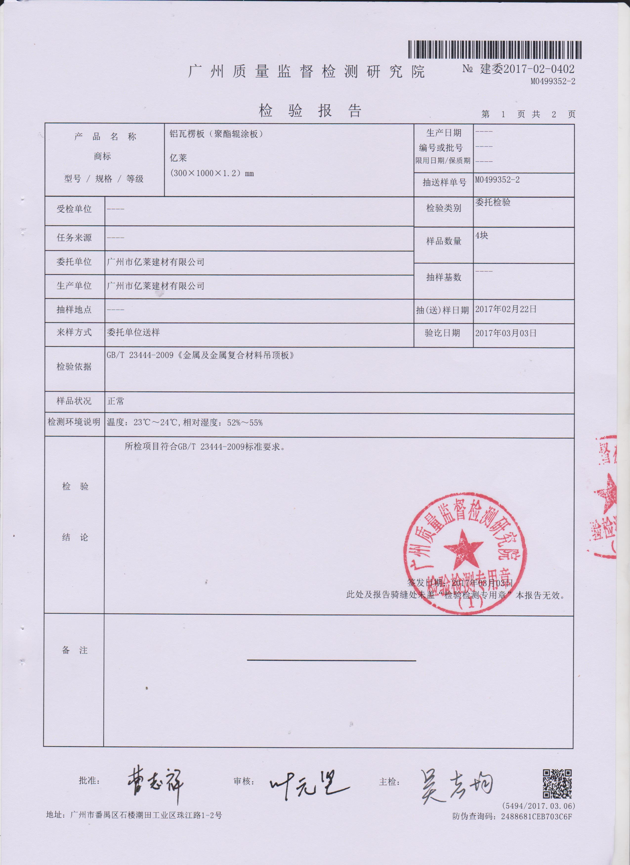 鋁瓦楞板(聚酯輥涂板)檢測報(bào)告