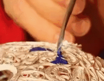 燒藍(lán) 是將整個(gè)胎體填滿色釉后,再拿到爐溫大約800℃的高爐中烘燒,色釉由砂粒狀固體熔化為液體,待冷卻后成為固著在胎體上的絢麗的色釉,此時(shí)色釉低于銅絲高度,所以得再填一次色釉,再經(jīng)燒結(jié),一般要連續(xù)四五次,直至將紋樣內(nèi)填到與掐絲紋相平。