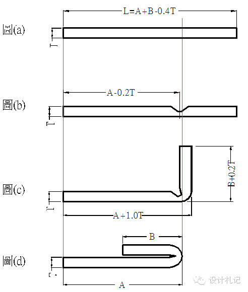 4.13側(cè)沖壓平 圖(a): 展開(kāi)長(zhǎng)度 L=A+B-0.4T 圖(b): 壓線(xiàn)位置尺寸 A-0.2T 圖(c): 90°折彎處尺寸為A+1.0T 圖(d): 側(cè)沖壓平后的產(chǎn)品形狀 |