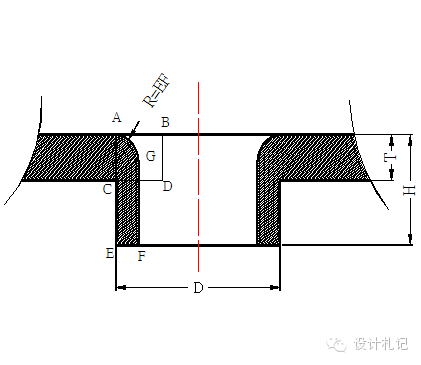 4.8 抽芽 抽芽孔尺寸計(jì)算原理為體積不變?cè)?/span>,即抽孔前后材料體積不變;ABCD四邊形面積=GFEA所圍成的面積. 一般抽孔高度不深取H=3P(P為螺紋距離),R=EF見(jiàn)圖 ∵ T*AB=(H -EF)*EF+π*(EF)2/4 ∴ AB={H*EF+(π/4-1)*EF2}/T ∴預(yù)沖孔孔徑=D – 2AB T≧0.8時(shí),取EF=60%T. 在料厚T<0.8時(shí),EF的取值請(qǐng)示上級(jí). |