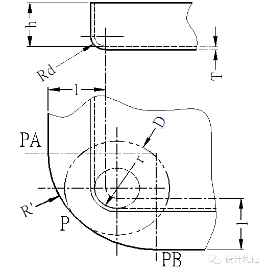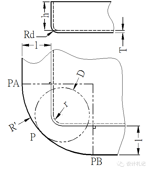 4.11壓縮抽形2 (Rd>1.5T) 原則:直邊部分按彎曲展開(kāi),圓角部分按拉伸展開(kāi),然后用三點(diǎn)切圓(PA-P-PB)的方式作一段與兩直邊和直徑為D的圓相切的圓弧. 當(dāng)Rd>1.5T時(shí): l按相應(yīng)折彎公式計(jì)算. D/2={(r+T/3)2 +2(r+T/3)*(h+T/3) -0.86*(Rd-2T/3)*[(r+T/3) +0.16*(Rd-2T/3)]}1/2 |