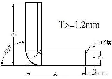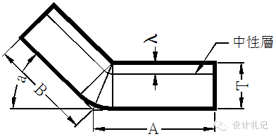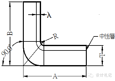 4.3 R≠0 θ=90° L=(A-T-R)+(B-T-R)+(R+λ)*π/2 當(dāng)R ≧5T時(shí) λ=T/2 1T≦ R <5T λ=T/3 0 < R <T λ=T/4 (實(shí)際展開(kāi)時(shí)除使用尺寸計(jì)算方法外,也可在確定中性層位置后,通過(guò)偏移再實(shí)際測(cè)量長(zhǎng)度的方法.以下相同) |